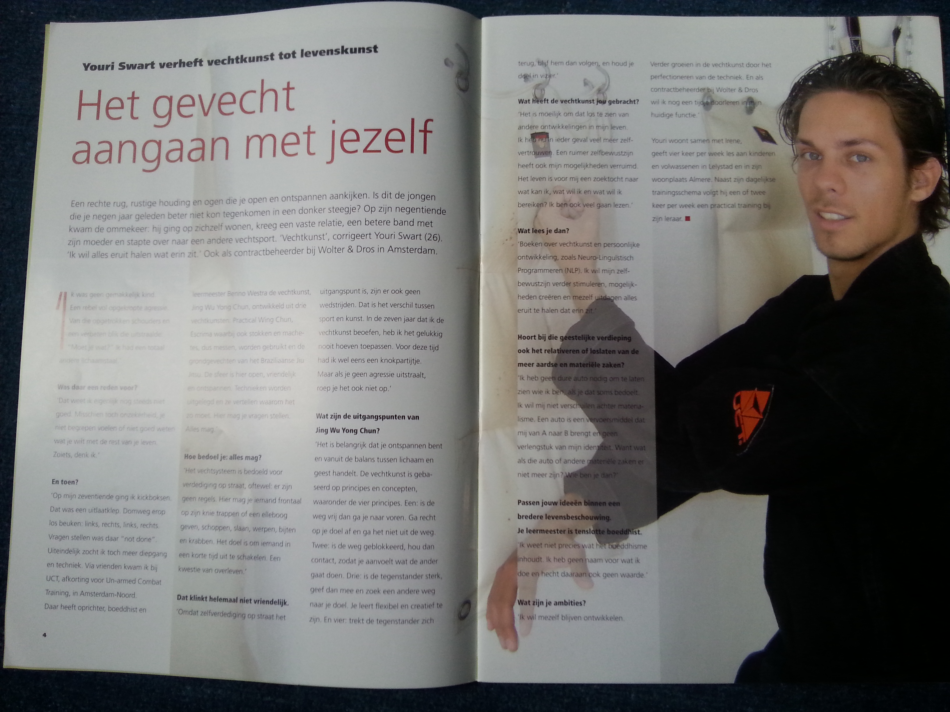 Een rechte rug, rustige houding en ogen die je open en ontspannen aankijken. Is dit de jongen die je negen jaar geleden beter niet kon tegenkomen in een donker steegje? Op zijn negentiende kwam de ommekeer: hij ging op zichzelf wonen, kreeg een vaste relatie, een betere band met zijn moeder en stapte over naar een andere vechtsport. “Vechtkunst”, corrigeert Youri Swart (26). “Ik wil alles eruit halen wat erin zit.” Ook als contractbeheerder bij Wolter & Dros in Amsterdam.